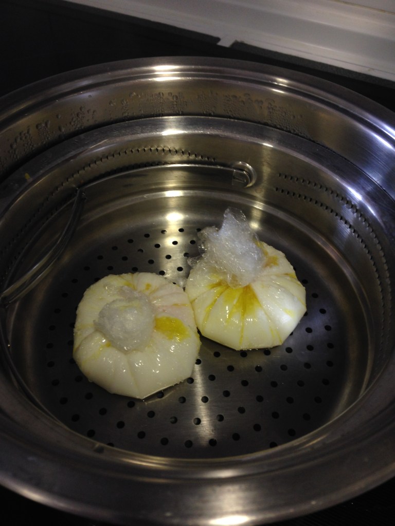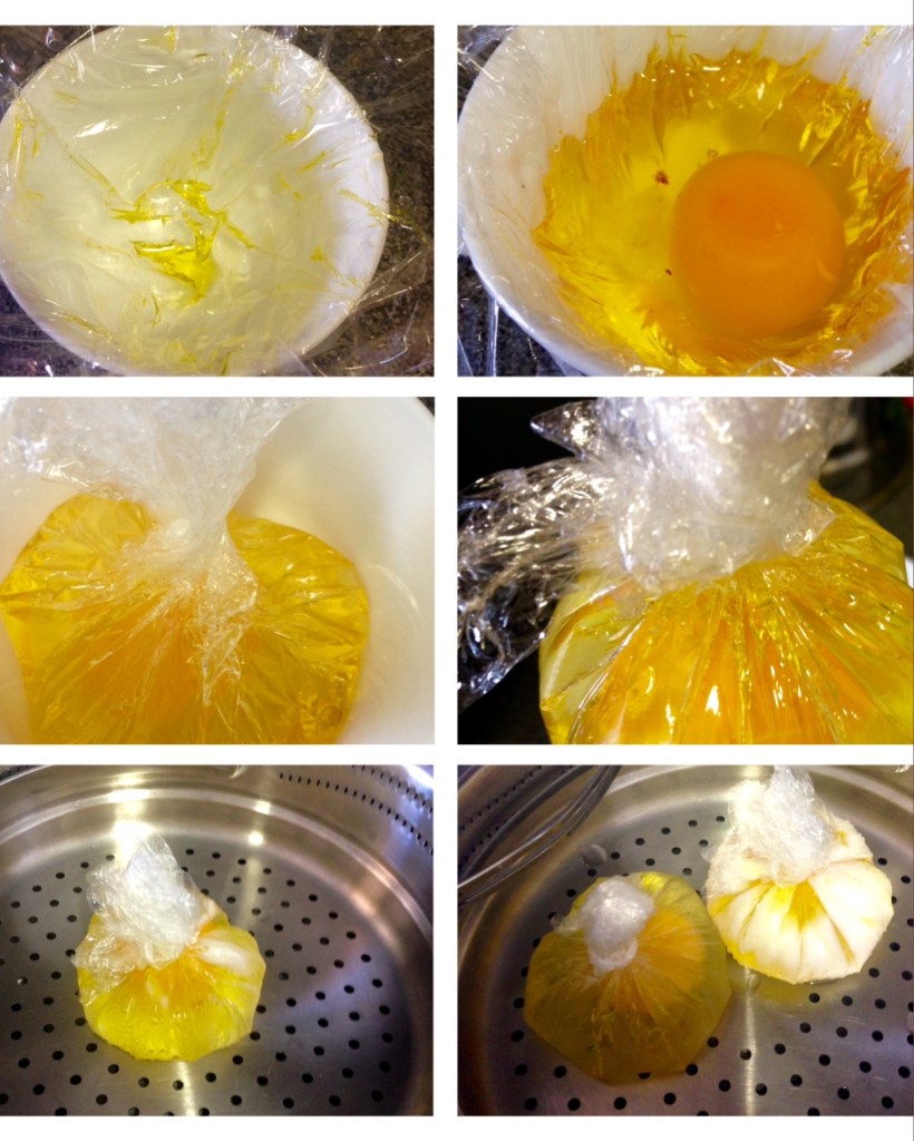 - Preparar los huevos como se ve en las fotos, y una vez hechos todos los saquitos que necesiten hacer, colocarlos en la pieza Varoma, la más profunda, taparla y reservar.