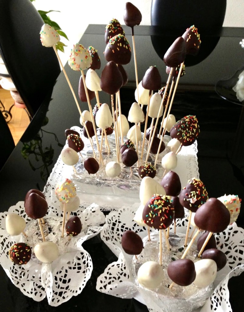 - O podemos dejar en las brochetas y antes que se quede duro el chocolate, adornar algunas con fideos de colores, almendra, crocante, anises, etc.