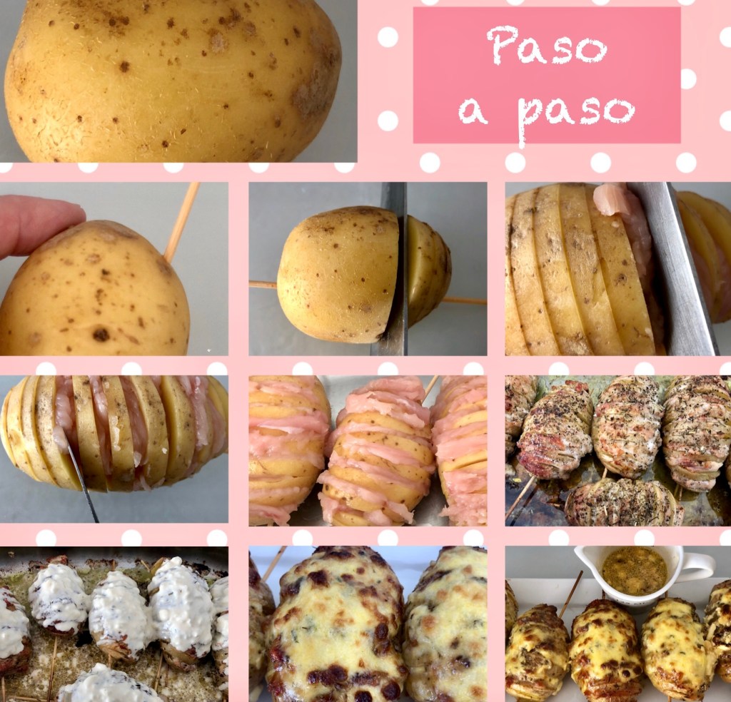 - Hacer tiras o trozos pequeños los filetes, tantos como ranuras de patata, ir metiéndolos en las ranuras como en la foto, hasta rellenarlas bien.