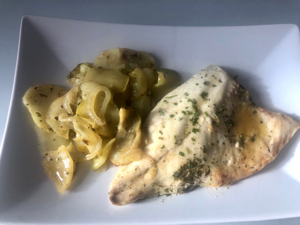 SEGUNDO PLATO: Pescado al horno sobre cama de patata y cebolla