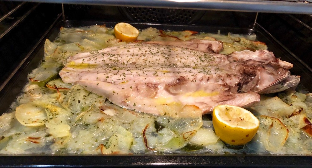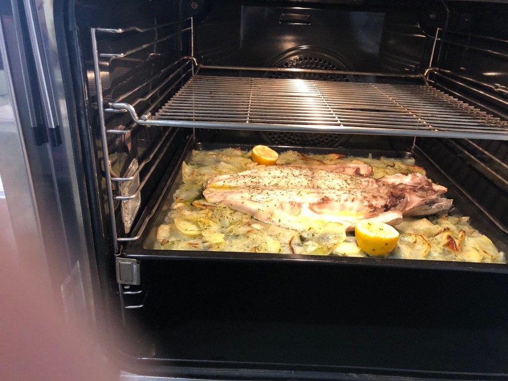 - Meter la bandeja al horno unos 10 min. a 180º, pasado ese tiempo abrir y mover la bandeja, ver como va la patata, bien seria quedar a medio hacer antes de poner el pescado, si fuera necesario añadir otros 10 o 15 min, el tiempo dependerá del horno y la patata.