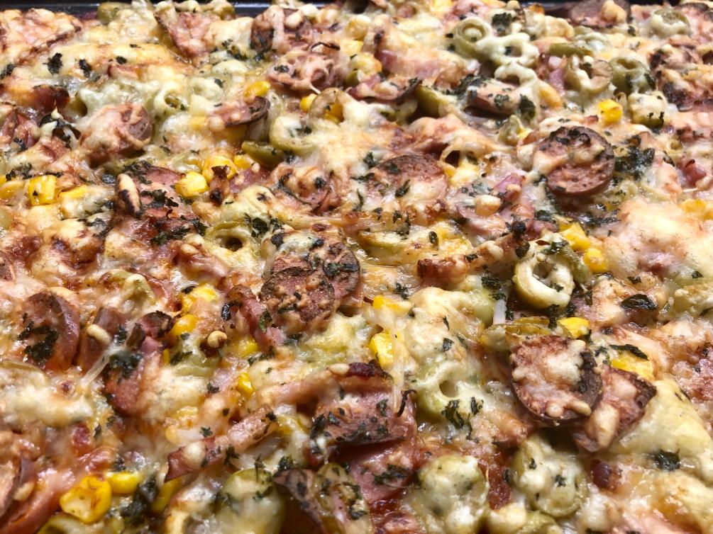 Salchichas, beicon, maiz, aceitunas en rodajas y por encima una mezcla de 4 quesos rayados y orégano fresco picado o seco, horneara a 200°, 15 min. aprox., y a disfrutarla.