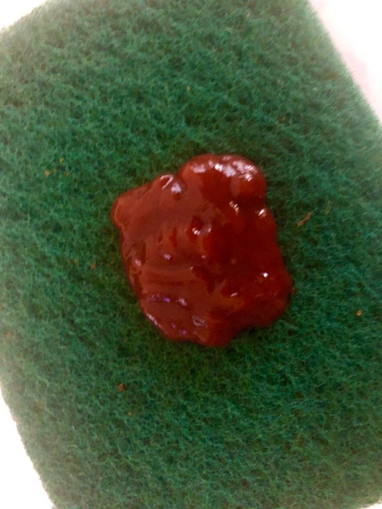 3º – Ahora quiero que veáis otro para limpiar las sartenes por detrás, es algo que todos tenemos en nuestros frigoríficos y es ketchup, se pone en un estropajo de los verdes y a frotar, si esta muy sucia tendréis que repetir un par de veces, también podéis hacer una especie de masa con vinagre, bicarbonato y el ketchup.