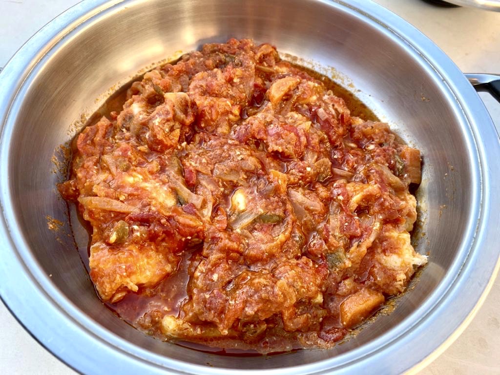 - Mientras tanto en una sartén extendida ponerla al fuego con 20 g de aceite, dar vuelta y vuelta al bacalao, cortar 3 pimientos de piquillo en juliana, añadirlos al bacalao darle una vuelta con el bacalao y echarle lo reservado, dejar a todo junto unos 10 o 15 min y estará listo para servir.