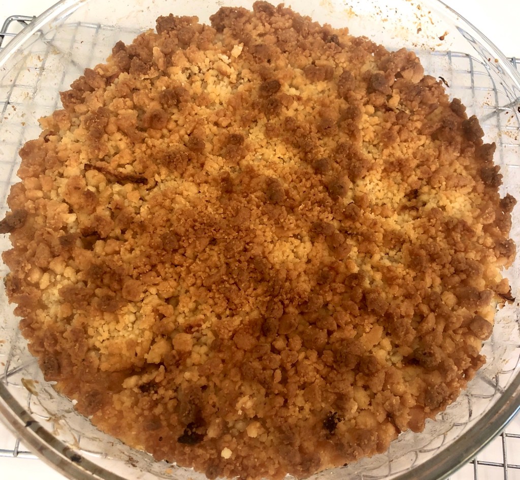 - En la una sartén poner 70 g de mantequilla , cuando esté derretida añadir 100 g de harina aprox., mas 3 cucharadas de azúcar y canela al gusto, tostar la harina hasta tener una masa arenosa, si no queda arenosa añadir un poco más de harina, cuando la tengamos lista, ponerla sobre las manzanas reservadas cubriéndolas con la mezcla, precalentar el horno a 180° arriba y abajo hornear durante 30 o 40 min., hasta tener la superficie dorada y crujiente.