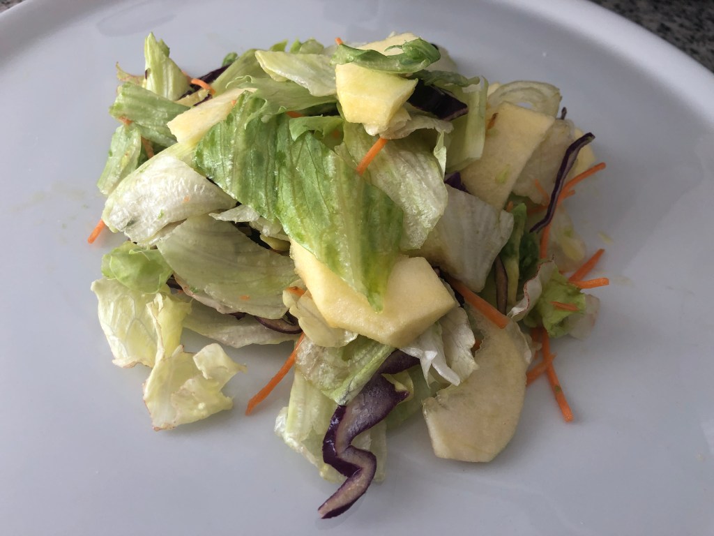 - En esta ocasión la en salada es 4 estaciones, más 1 manzana helada y fileteada y 1/2 aguacate, aliñada con sal, vinagre de manzana y aceite de oliva.