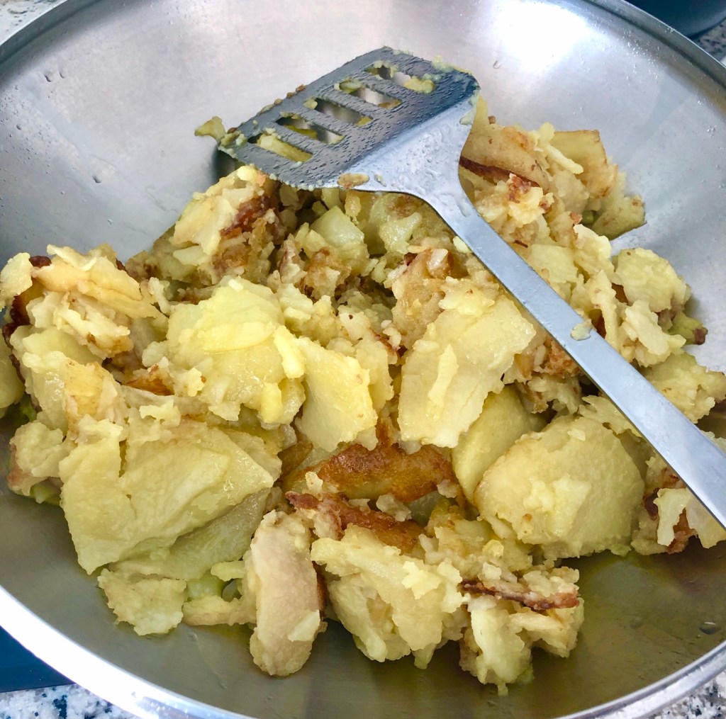 Este plato lo recuerdo desde pequeña, lo hacia mi madre y ella las patatas las cortaba siempre finas, cuando cuidaban a los nietos todos le pedían patatas pegadas con huevos revueltos, era como ellos las llamaban y Ella se las hacia encantada, esta es la razón por la que corto y las hago así.