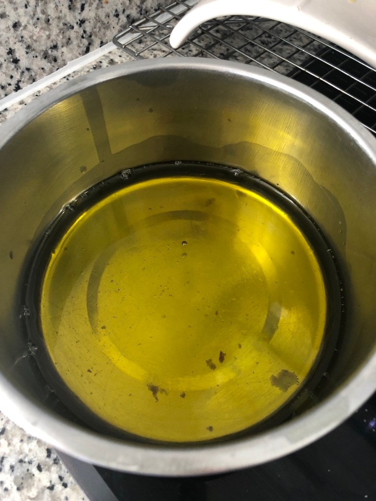- Mientras tanto se pone en una sartén 200 o 250 g aprox. de aceite de oliva, se pone a calentar a fuego medio.