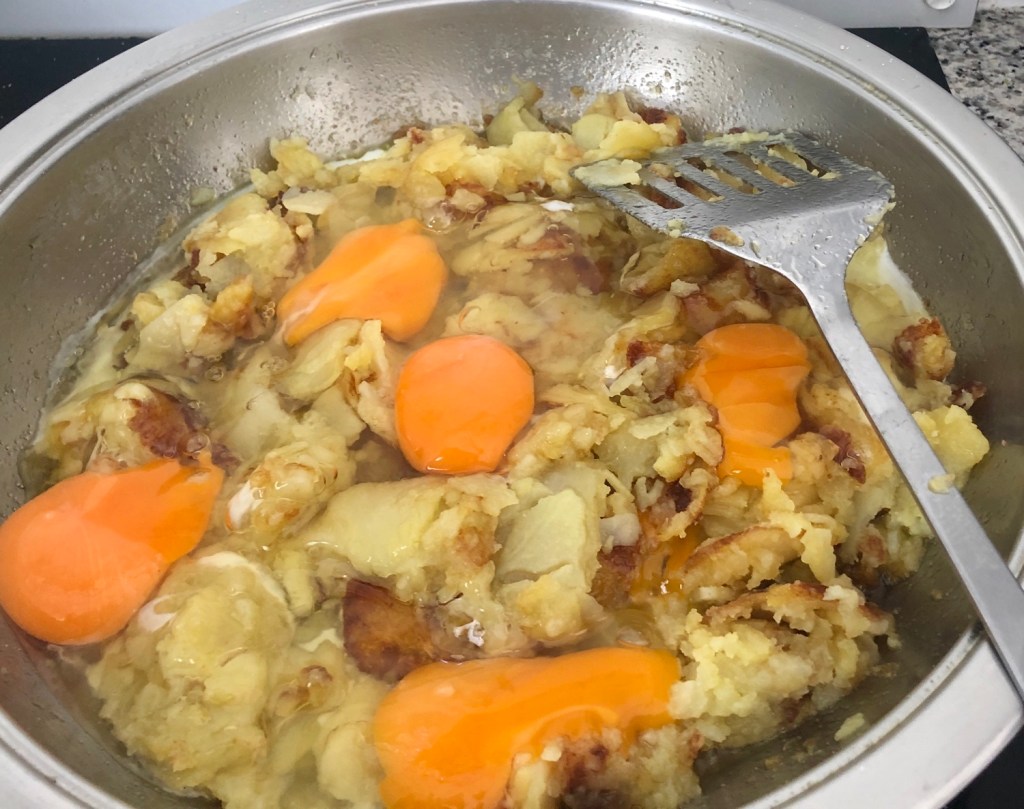 - Añadimos 4 o 5 huevos según tamaño, apagar el fuego y romper las yemas un poco, dejándolas quietas y se cuajaran con el propio calor de las patatas.