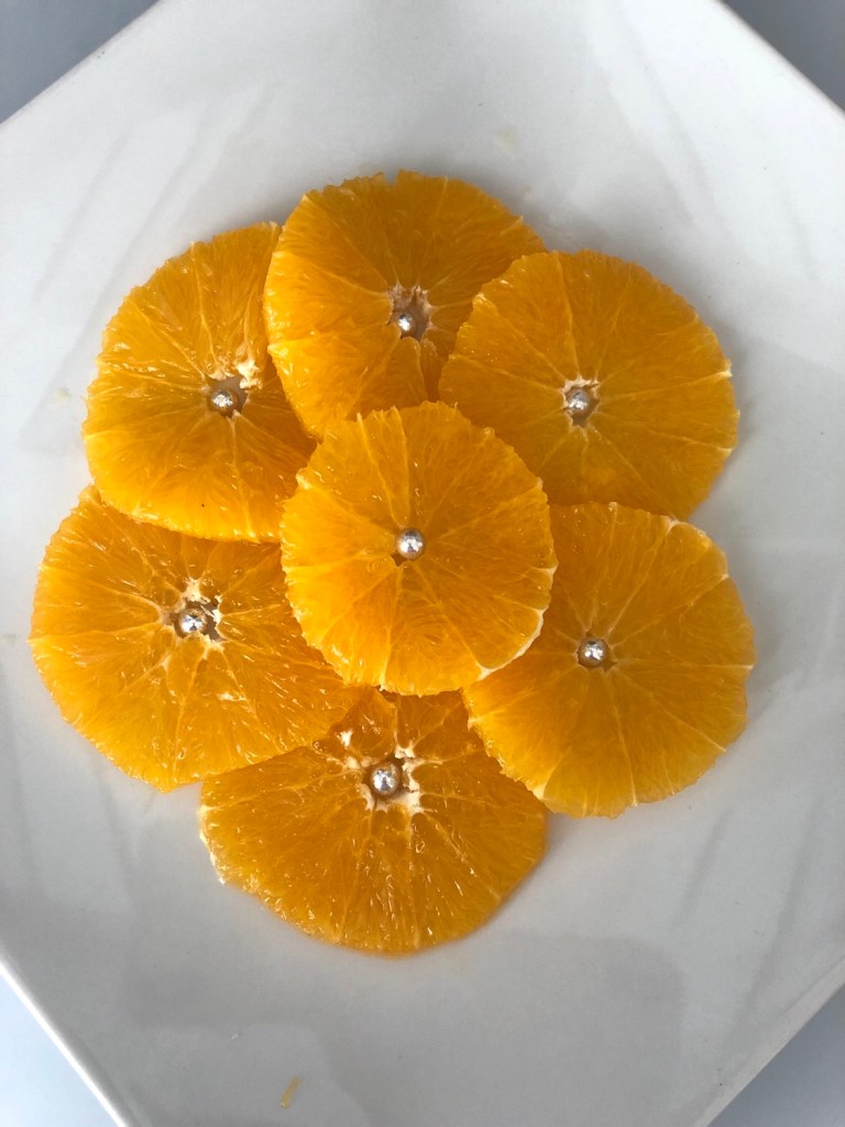 - Pelar 1 naranja por persona y limpiarle bien todo lo blanco, cortarla en rodajas y si no es muy dulce ponerle un poquito de azúcar o miel por encima si las naranjas son muy acidas, en este caso eran muy dulces y solo las decore.