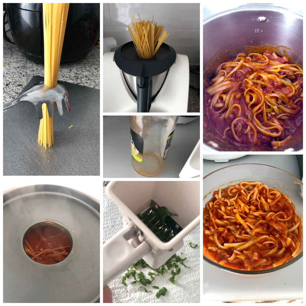 - En robot, sea el modelo que sea, con giro a la izquierda velocidad cuchara o con mariposa y temperatura baja, cuando la pasta termine de bajar del todo y este todo dentro, miramos el tiempo que queda y si quedan más minutos de los que pone el paquete de la pasta los restamos en el programador, o añadimos si fuera el caso, es más fácil añadir al final tiempo que dejar que la pasta se pase. ( El poner 20 min. es un poco para orientarnos, todo dependerá de la temperatura que tuviera el tomate y el agua y de ello dependerá que baje más pronto la pasta, para empezar a contar los minutos reales de cocción de la misma). – En cazuela al fuego una vez que la pasta esta dentro y todo junto hirviendo bajar la temperatura a media baja y contar los minutos de cocerse la pasta, par vuelta de vez en cuando.