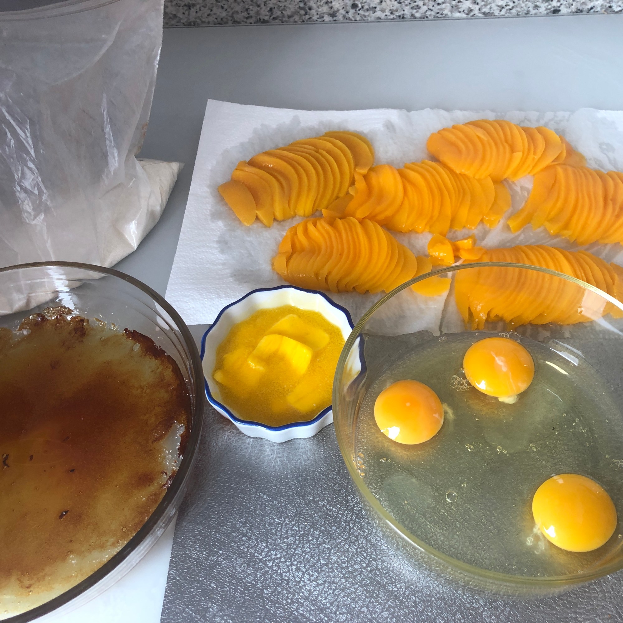 - 100 g de azúcar de abedul, para hacer caramelo liquido en el molde mojado con limón ( O sustituir por caramelo preparado, sirope, miel, un poco de mermelada de melocotón.