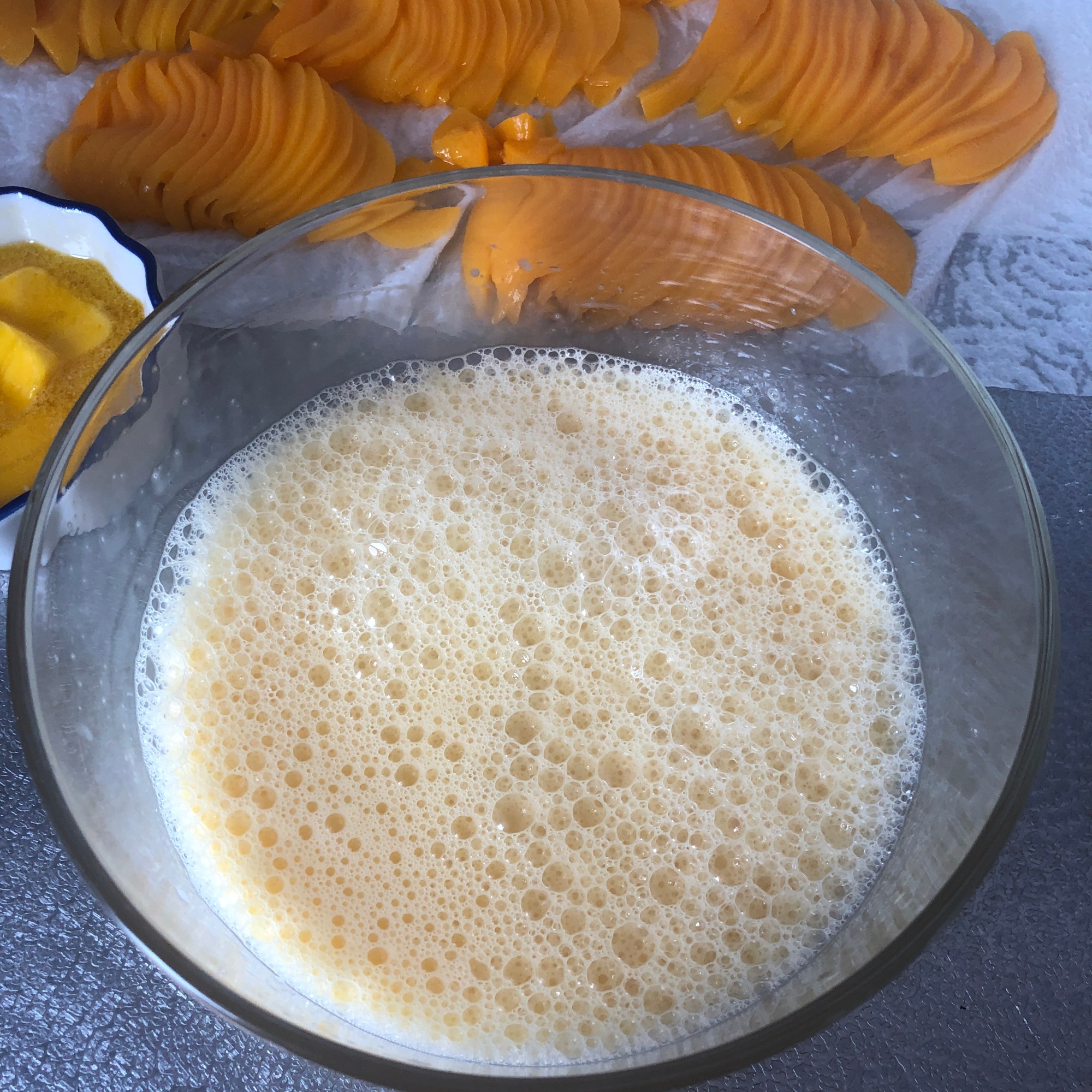 - 6 mitades de melocotón en almíbar ligero y como se ve en la foto lo fileteamos muy fino, y secamos sobre papel de cocina
