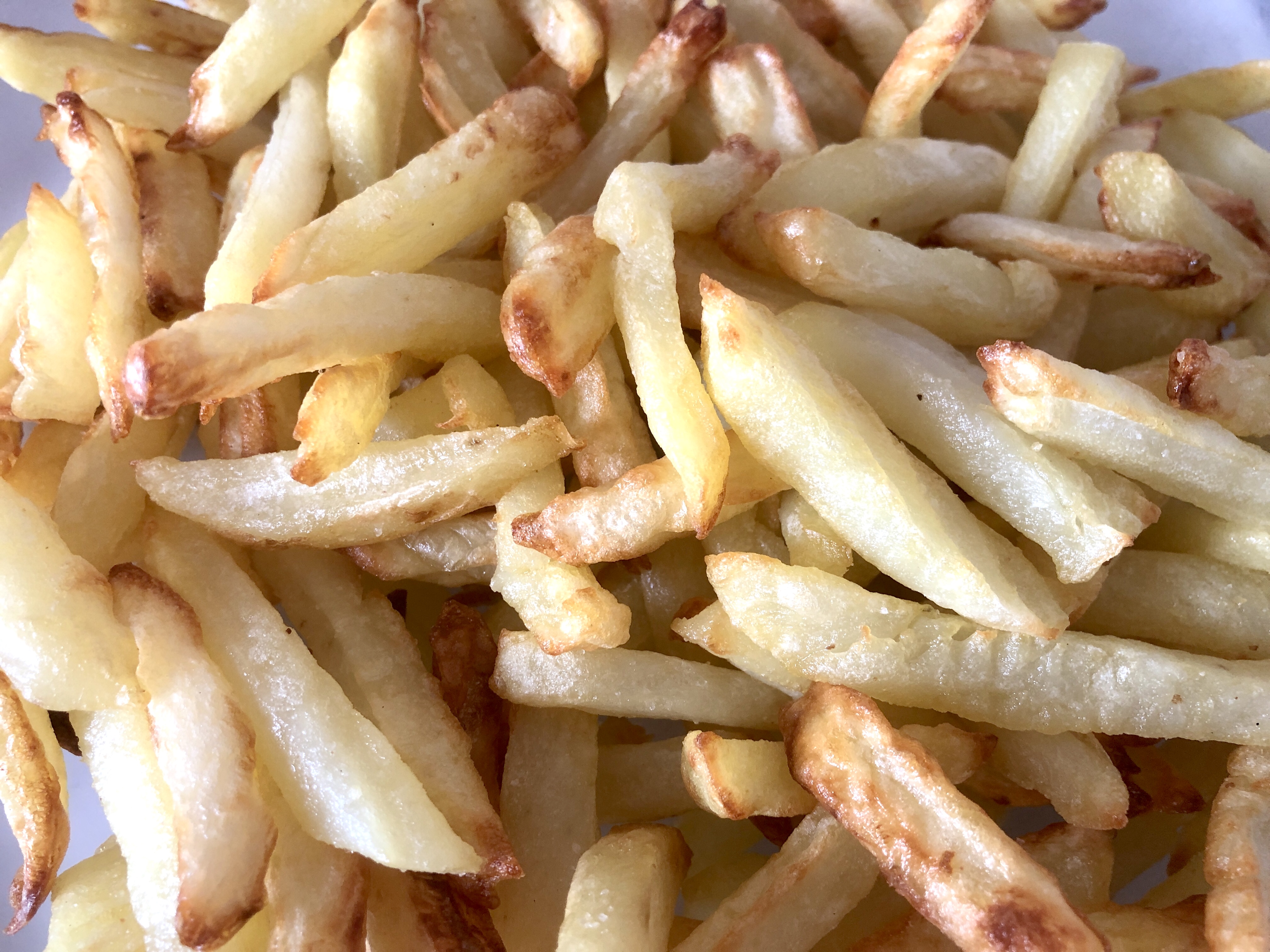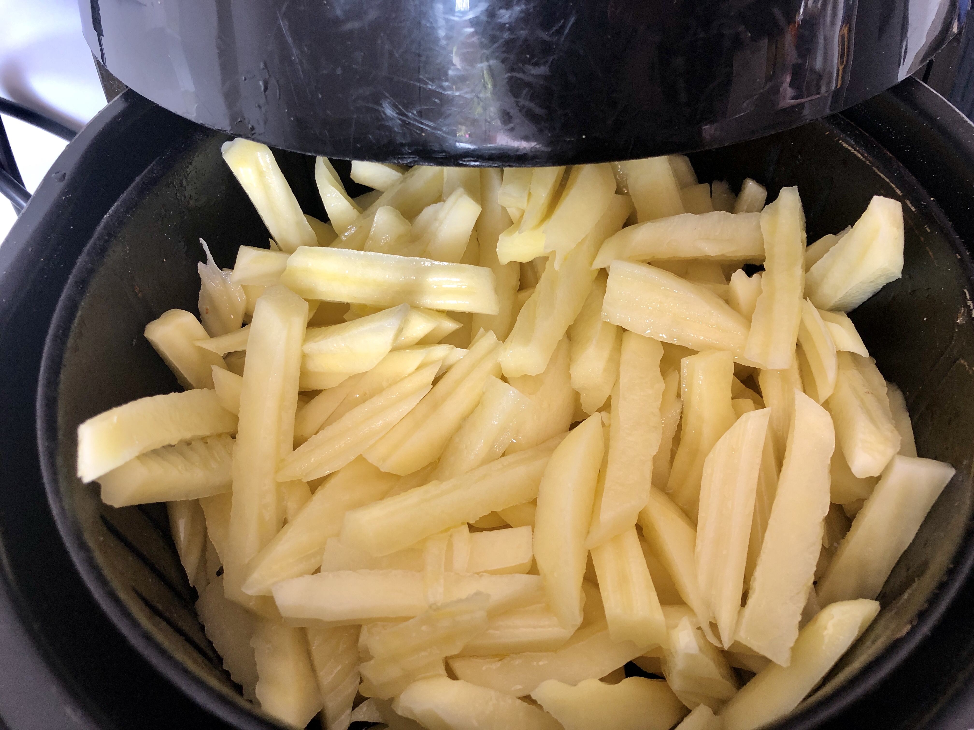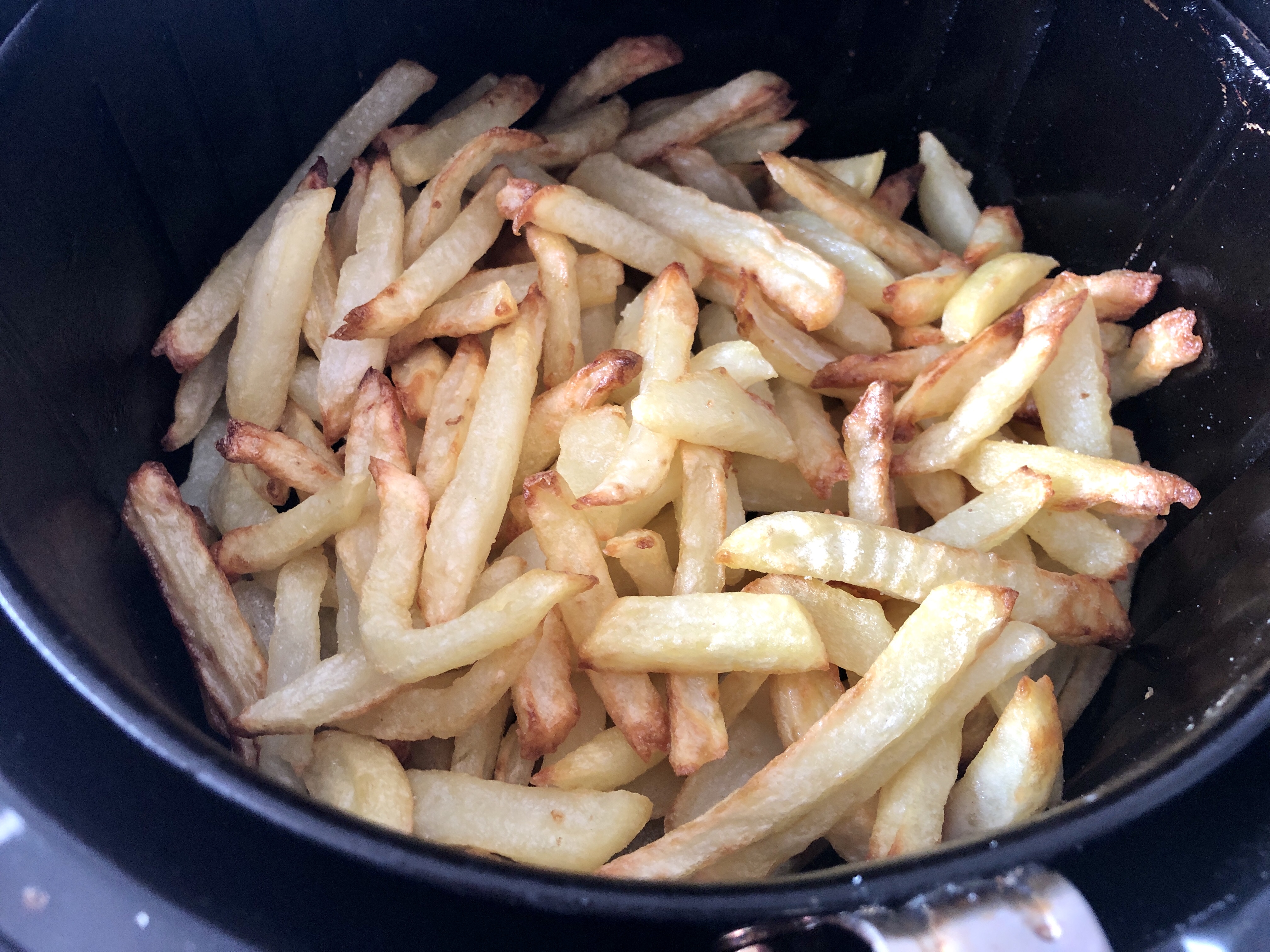 - Para que las patatas queden bien es importante pelarlas, cortarlas, lavarlas, secarlas y poner 20 min., moviendo el recipiente de vez en cuando, a temperatura 160º, después a 200º el tiempo necesario y darles vueltas de vez en cuando sin tocarlas, moviendo el recipiente, hasta el punto que cada uno las quiere de doradas, importante la sal ponérsela una vez sacadas del aparato cuando están calientes, la sal cuando se enfrían no la cogen y listas para disfrutar.