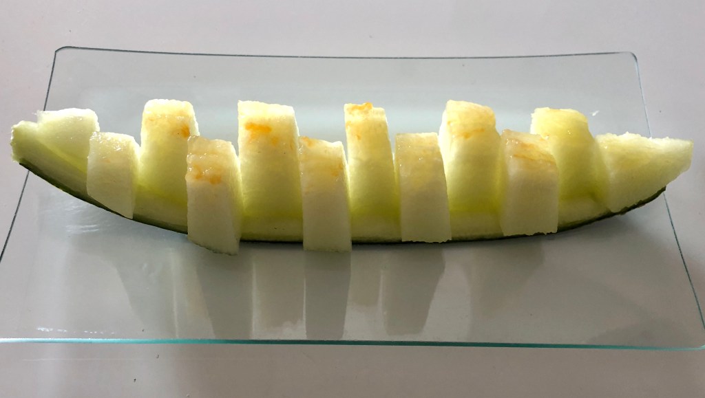 De postre como se que coméis poca fruta una fácil de preparar y muy refrescante, una raja de melón.