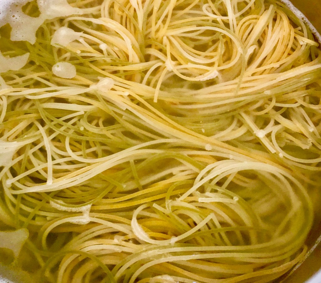 - Cocer ligeramente la pasta, como es muy fina solo darle un hervor, para que se termine de hacer con el resto de ingredientes..