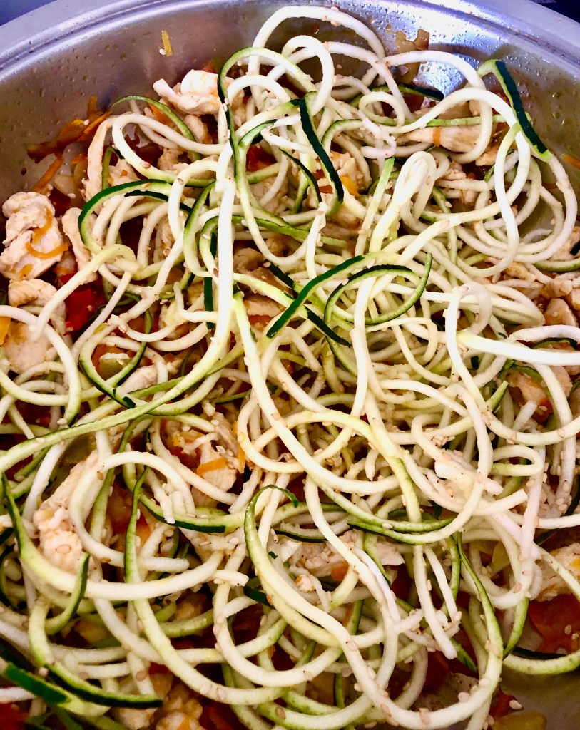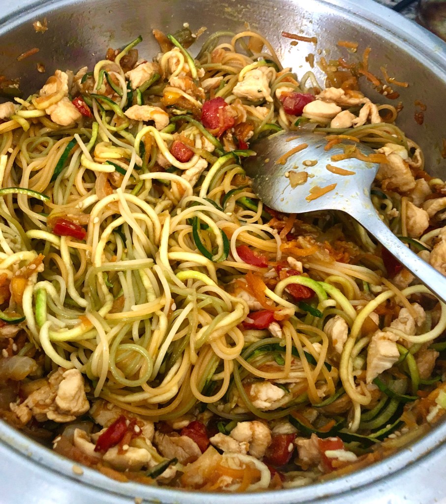 - Cuando este hecho el pollo, añadir el calabacín, la pasta, la soja, darle unas vueltas a todo junto y añadir un poco de agua de cocción de la pasta, la cantidad al gusto según la salsa que se desea tener y lo fuerte que nos quedo el plato.