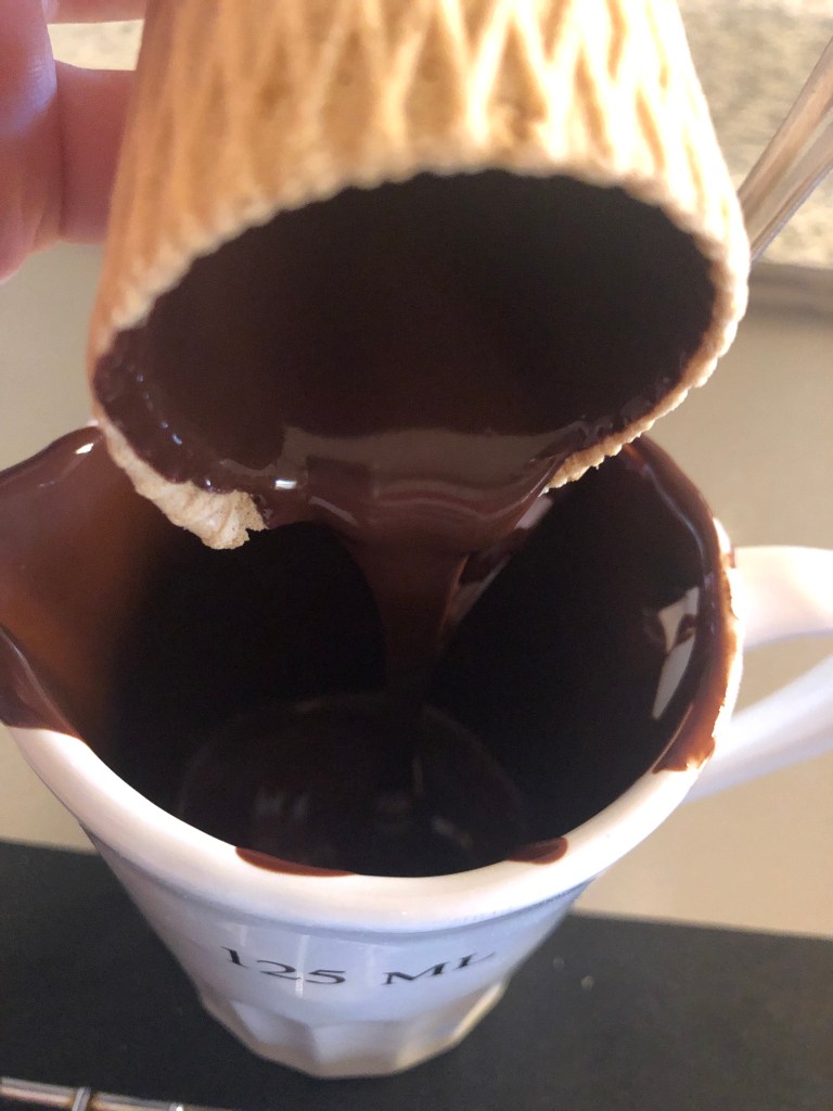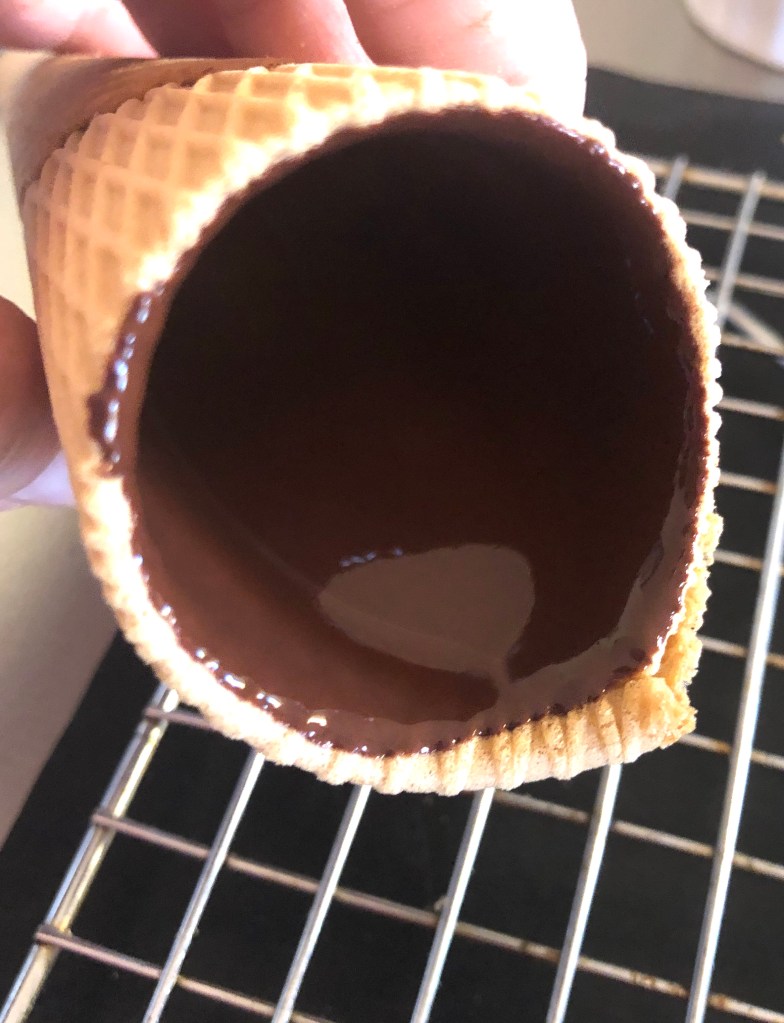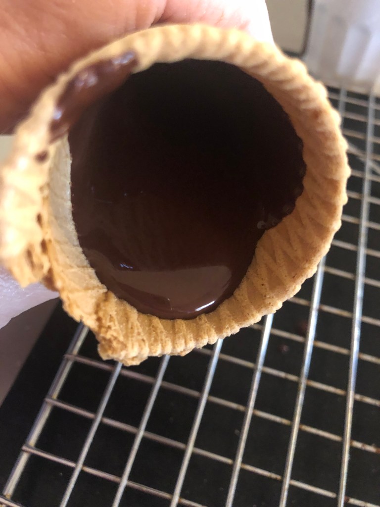 - Coger 1 cucurucho y llenarlo de chocolate fundido, vaciarlo, sin escurrir en exceso para que quede una capa consistente, como se ve en la foto.