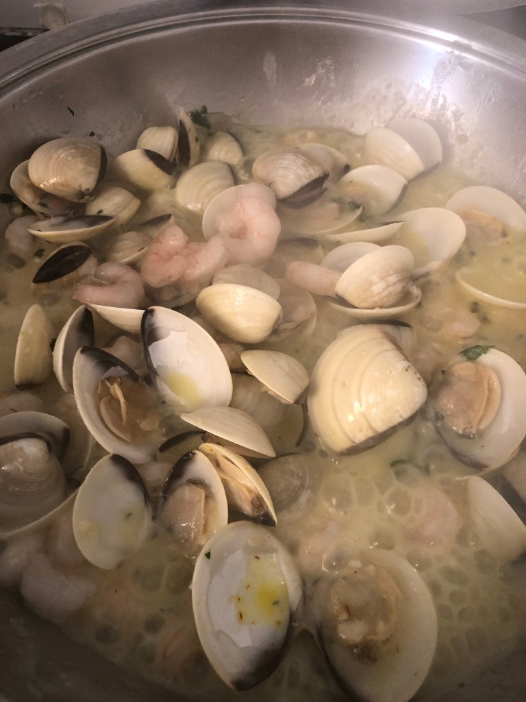 - Tapar y cuando las almejas estén abiertas incorporar el resto del caldo o agua, dejar hasta que rompa a hervir.