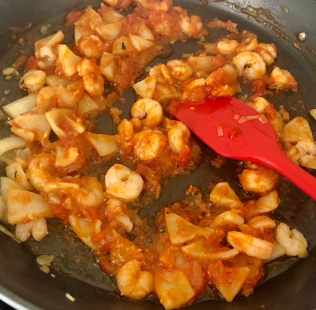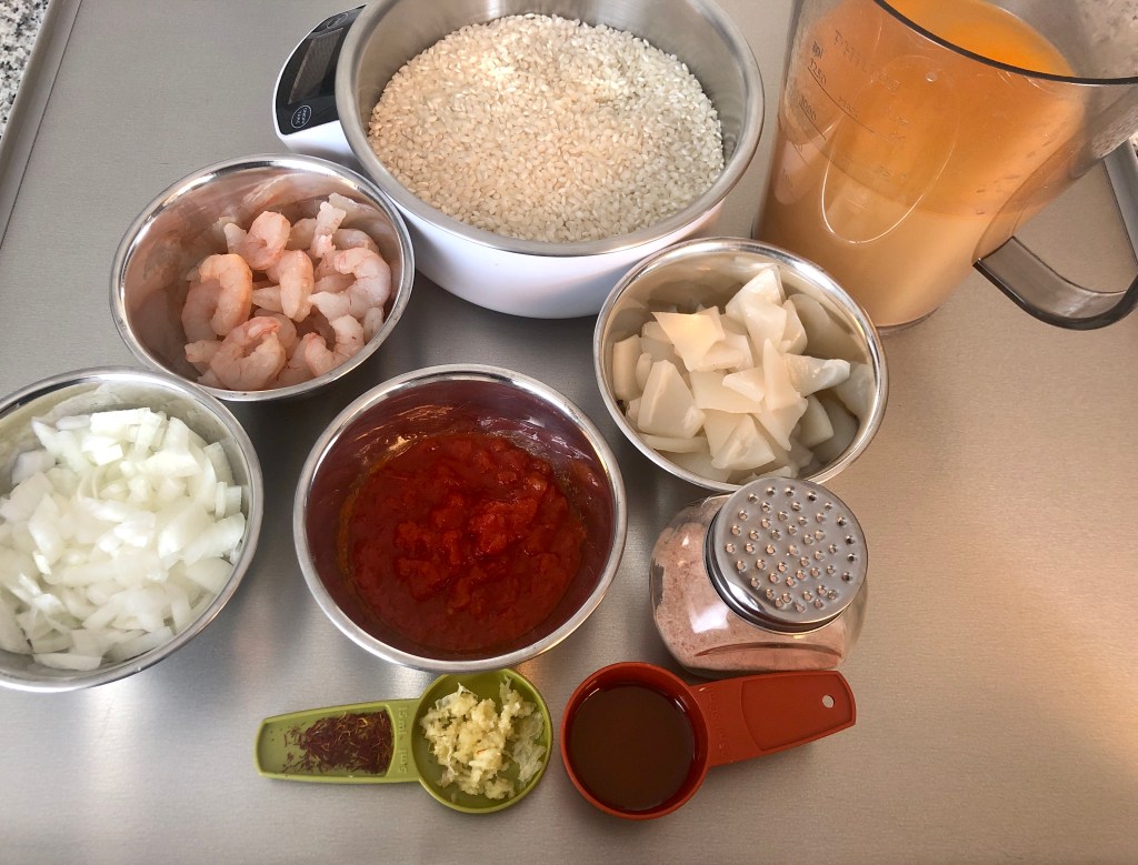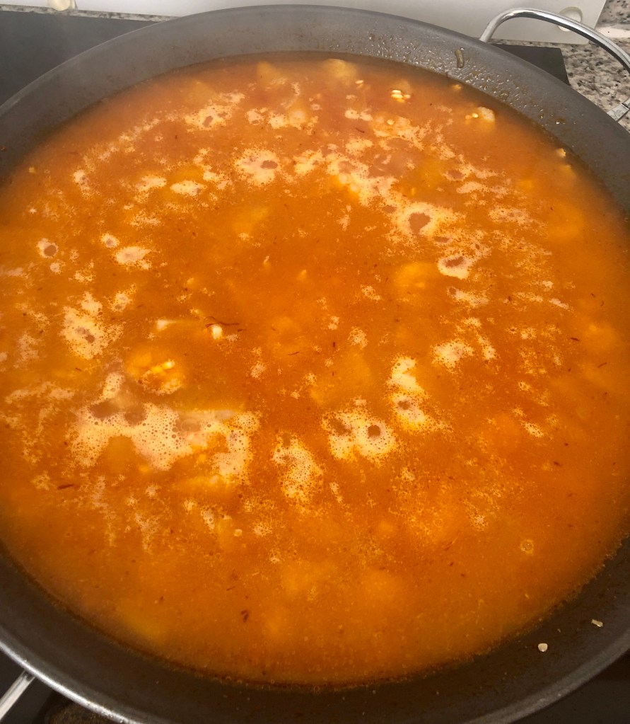- 800 g de caldo hecho con las cascaras y cabezas de las gambas.