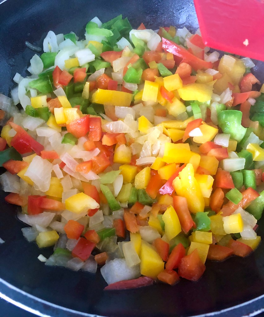 1. En una sartén con el aceite rehogar, la cebolla, y los pimientos unos minutos, cuando estén un poco hechos añadir la patata y seguir rehogando pero no mucho, tiene que quedar enterito para el tiempo de horno.