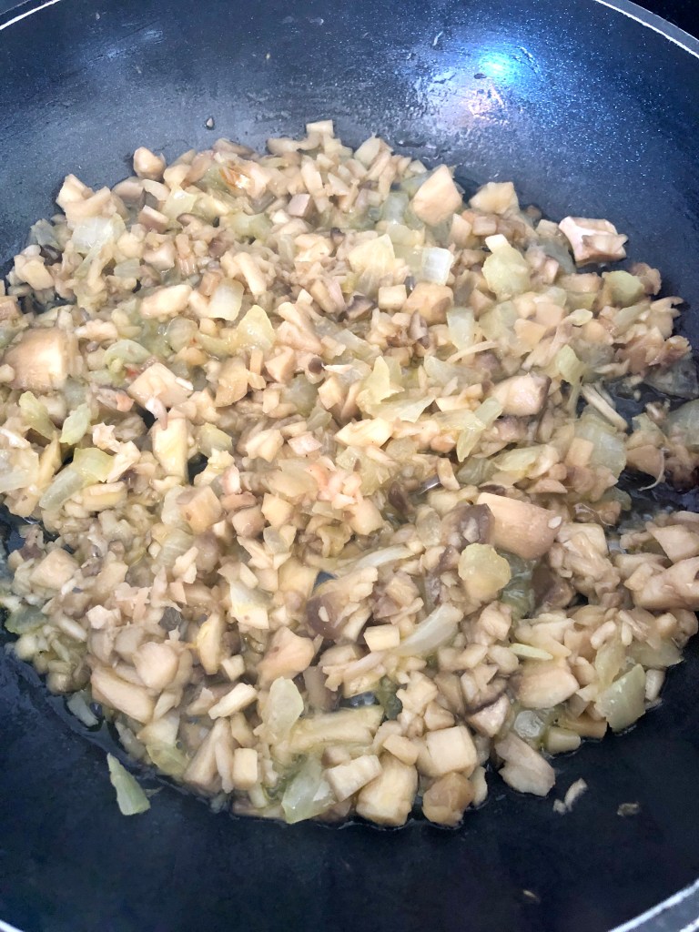 - Cortar los troncos reservados, la chalota ocebolla y echar todo en una sartén, junto con el aceite poner a fuego medio, rehogar unos 6 o 7 min.