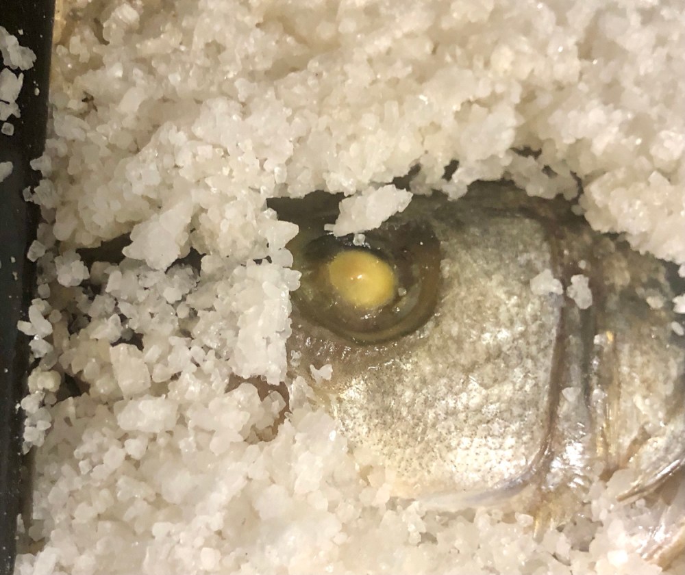 - Precalentar el horno a 210º, en turbo, o arriba y abajo poner la bandeja con el pescado dentro, hornear 20 min., sabremos que el pescado está en su punto cuando el ojo lo tenga blanco y la sal esté hecha un bloque, de lo contrario dejarlo algún minuto más.