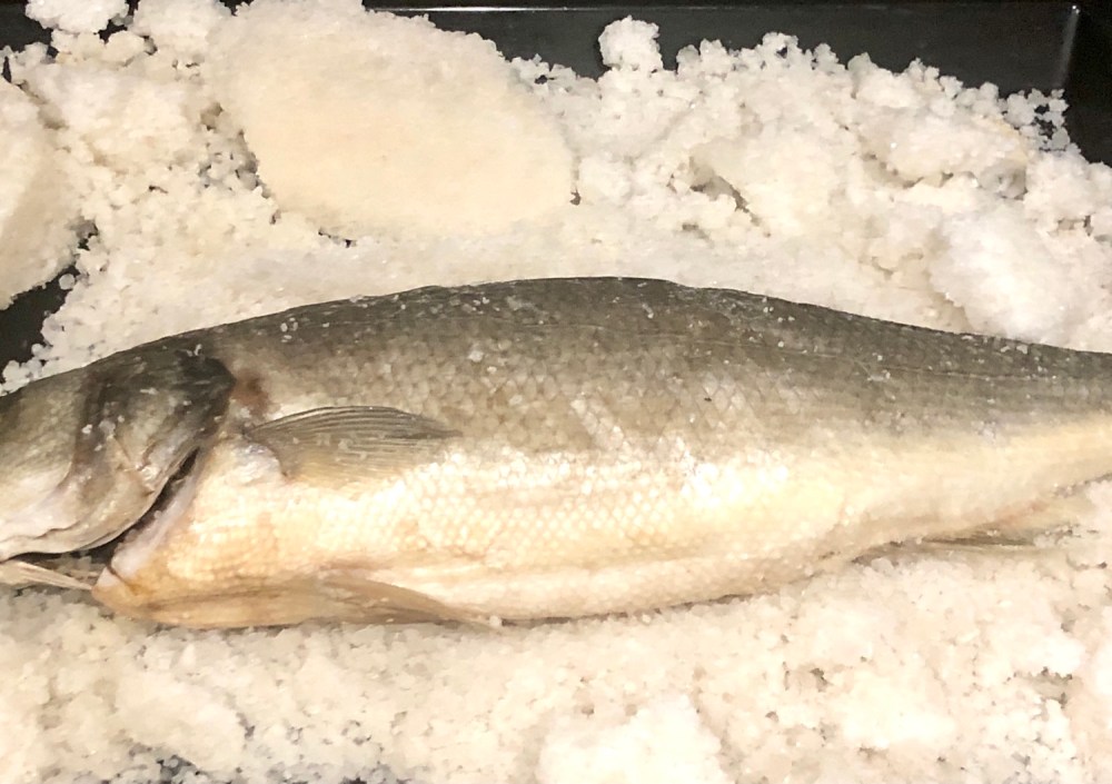 - Poner una capa de la mezcla de sal en la base de la bandeja o recipiente, apretarla, colocar la lubina encima y cubrir totalmente de sal aportándola hasta tener una capa compacta, se puede hacer con las manos o ayudarse de unas palas.