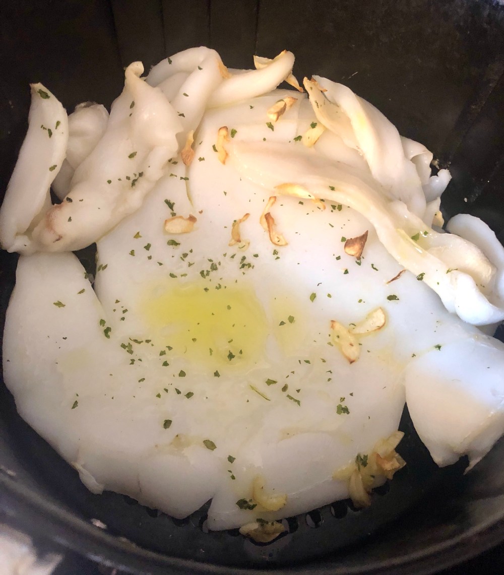 1. Poner en el cesto de la freidora la sepia, dejarla 5 min., solo a 160°.