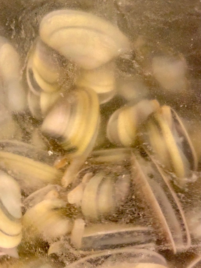 - En ese momento volver a poner las coquinas en el recipiente, cubrirlas bien de agua limpia, tienen que estar anchas para poderse abrir, echarles por encima 3 o 4 cucharadas soperas de sal gorda, ( la sal subir o bajar en función de la cantidad de coquinas).