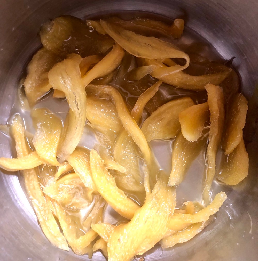 - Mirar el punto, si el liquido tomo cuerpo y el jengibre esta medio transparente retirarlo, de lo contrario dejarlo 5 ó 7 min. más, el punto final tiene que ser un poco crujiente y caramelizado, pero no demasiado espeso, ( hay que tener encuentra que al enfriar espesa, para no dejarlo demasiado seco ).