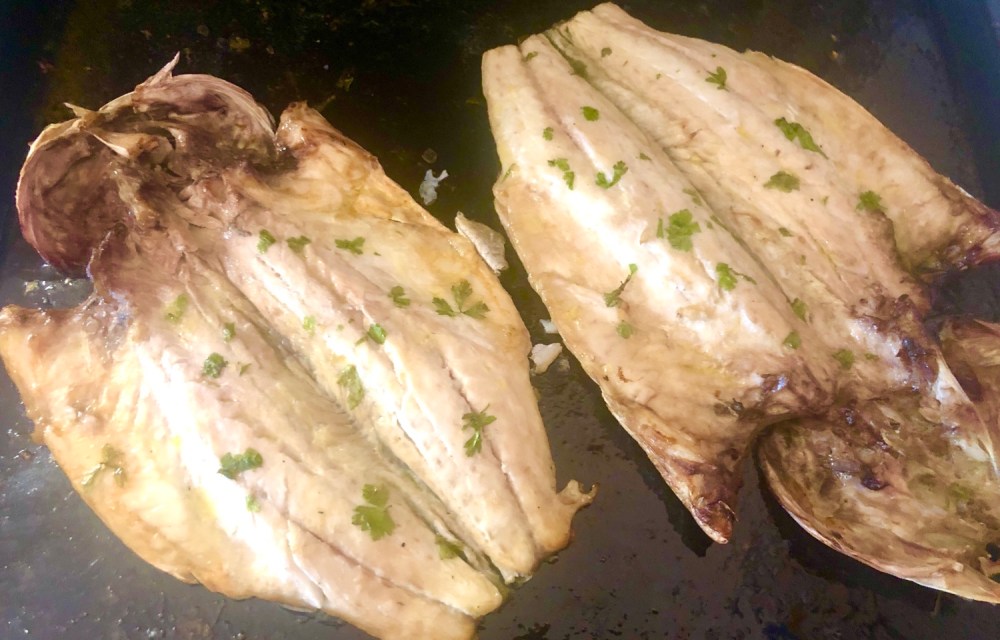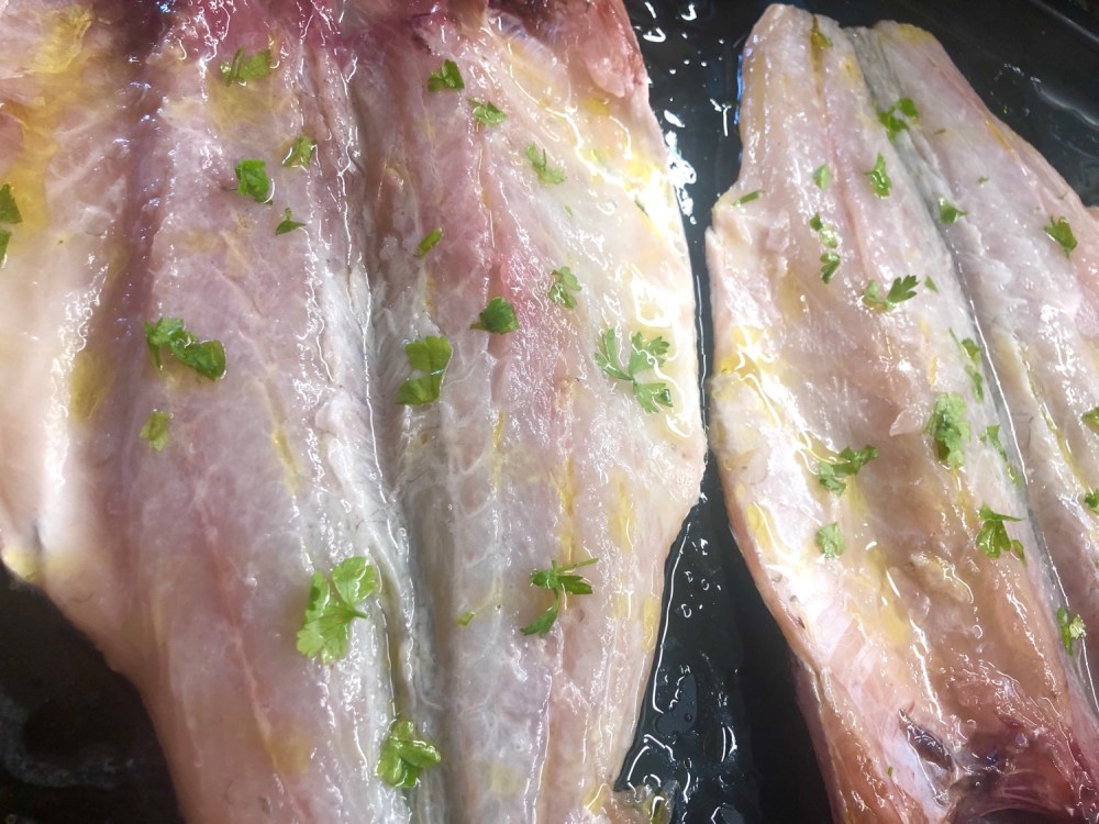 - Mientras tanto echar 20 g de aceite en la bandeja del horno, extenderlo en la zona donde irán las lubinas, ponerlas boca arriba como se ve en la foto, con sal al gusto, el perejil recién picado, el zumo limón y el vino.