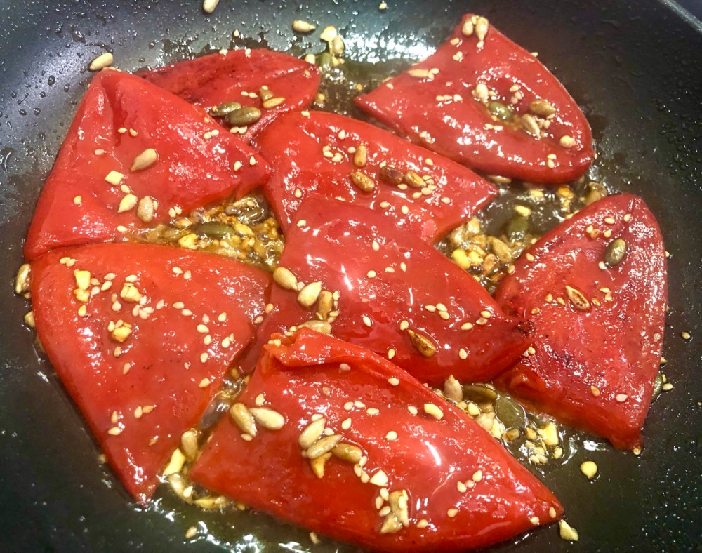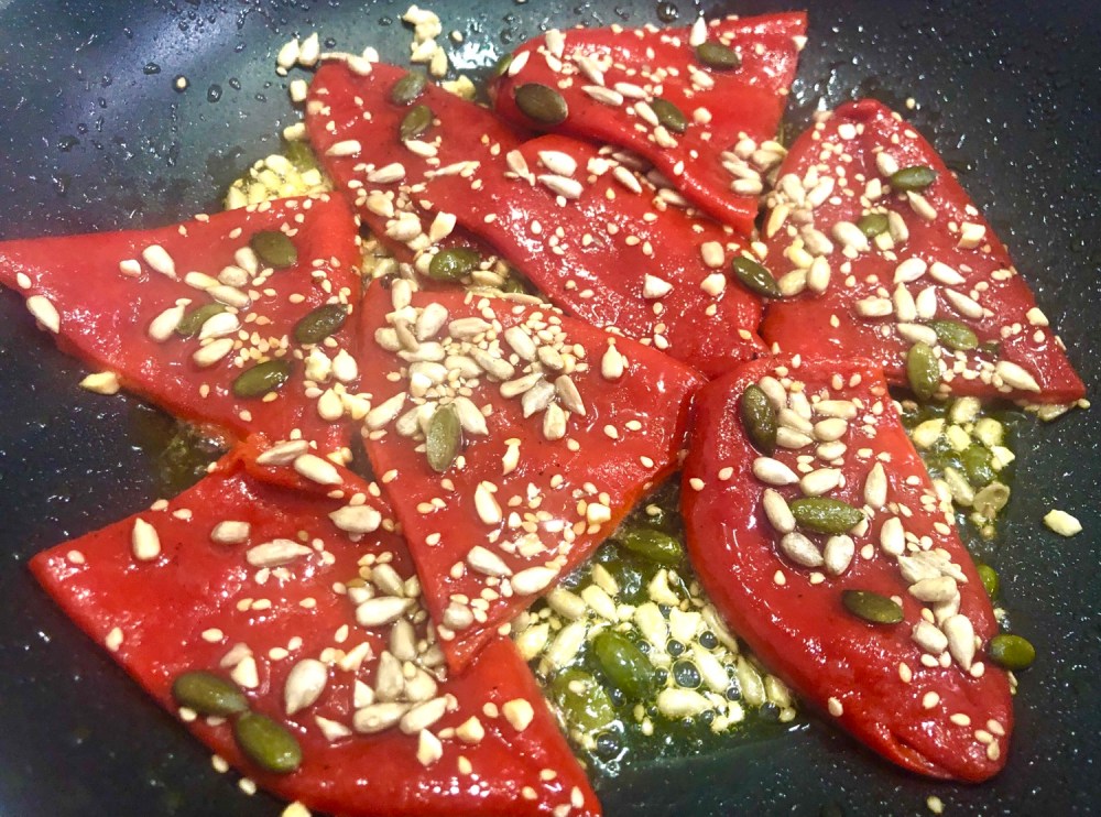 - A falta de cinco minutos aprox., hacer la guarnición poniendo una sartén con el resto del aceite y a fuego medio, una vez caliente añadir los pimientos, el mix de pipas, dejar hacerse un poco, darle la vuelta a los pimientos, dejar 1 o 2 min., apagar el fuego.
