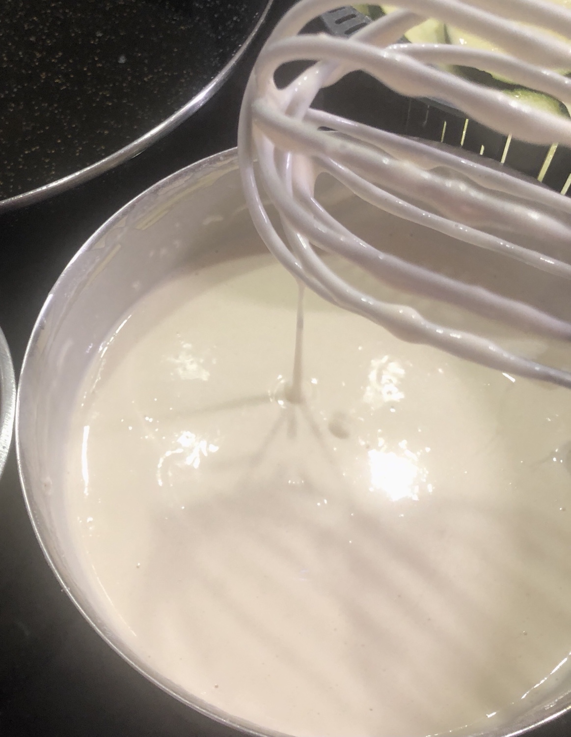- Poner la harina y un poco de sal en un bol, añadir poco a poco el agua muy fría con gas, moviendo la mezcla con varillas hasta tener una mezcla ligera, como se ve en las fotos.