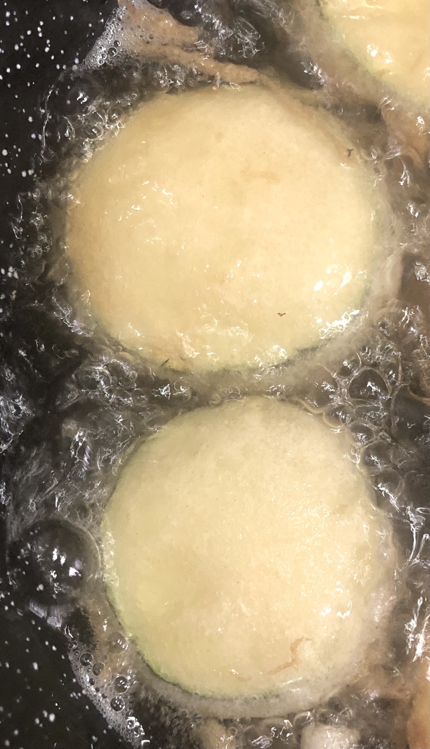 - Ir pasando el calabacín por la mezcla de harina y freír, hacerlo con el fuego medio, sacar con una espumadera escurriendo el aceite, dejarlas rodajas una vez fritas sobre papel absorbente.