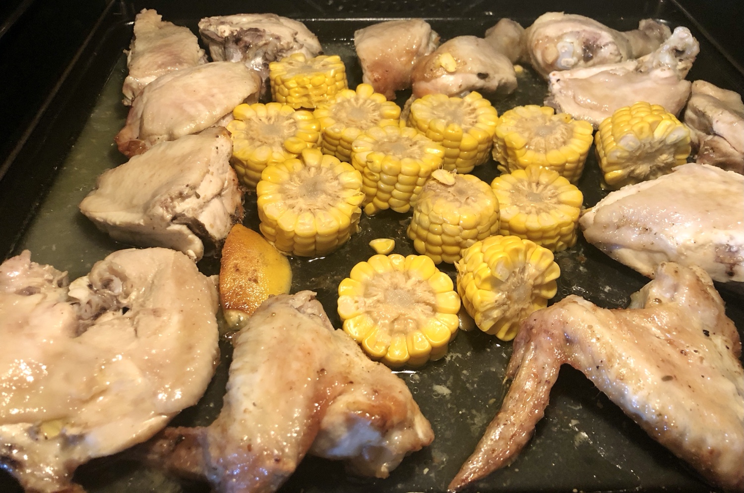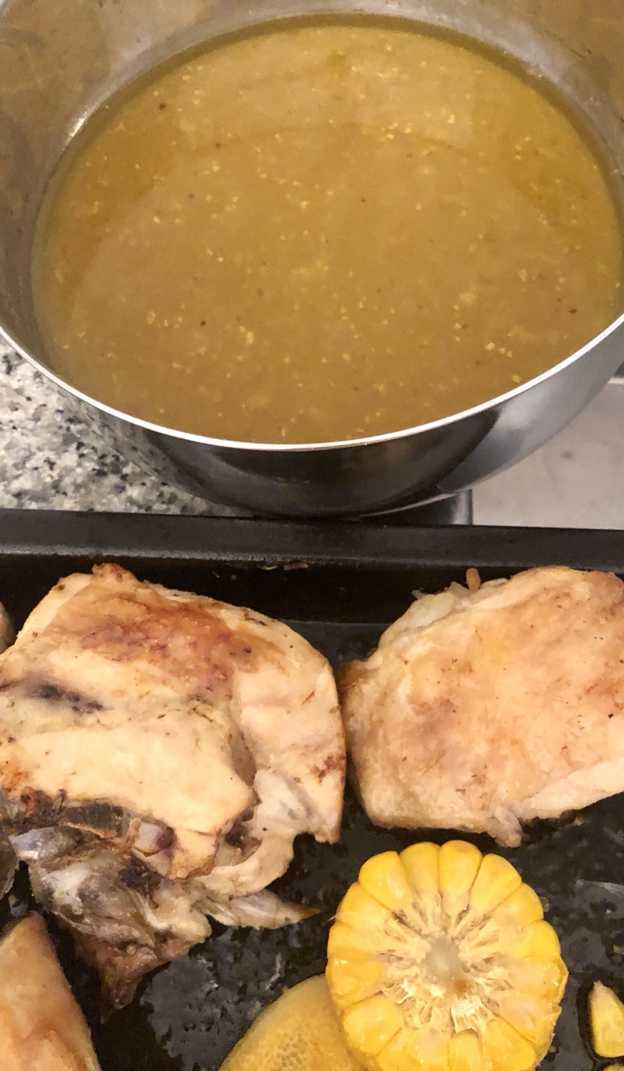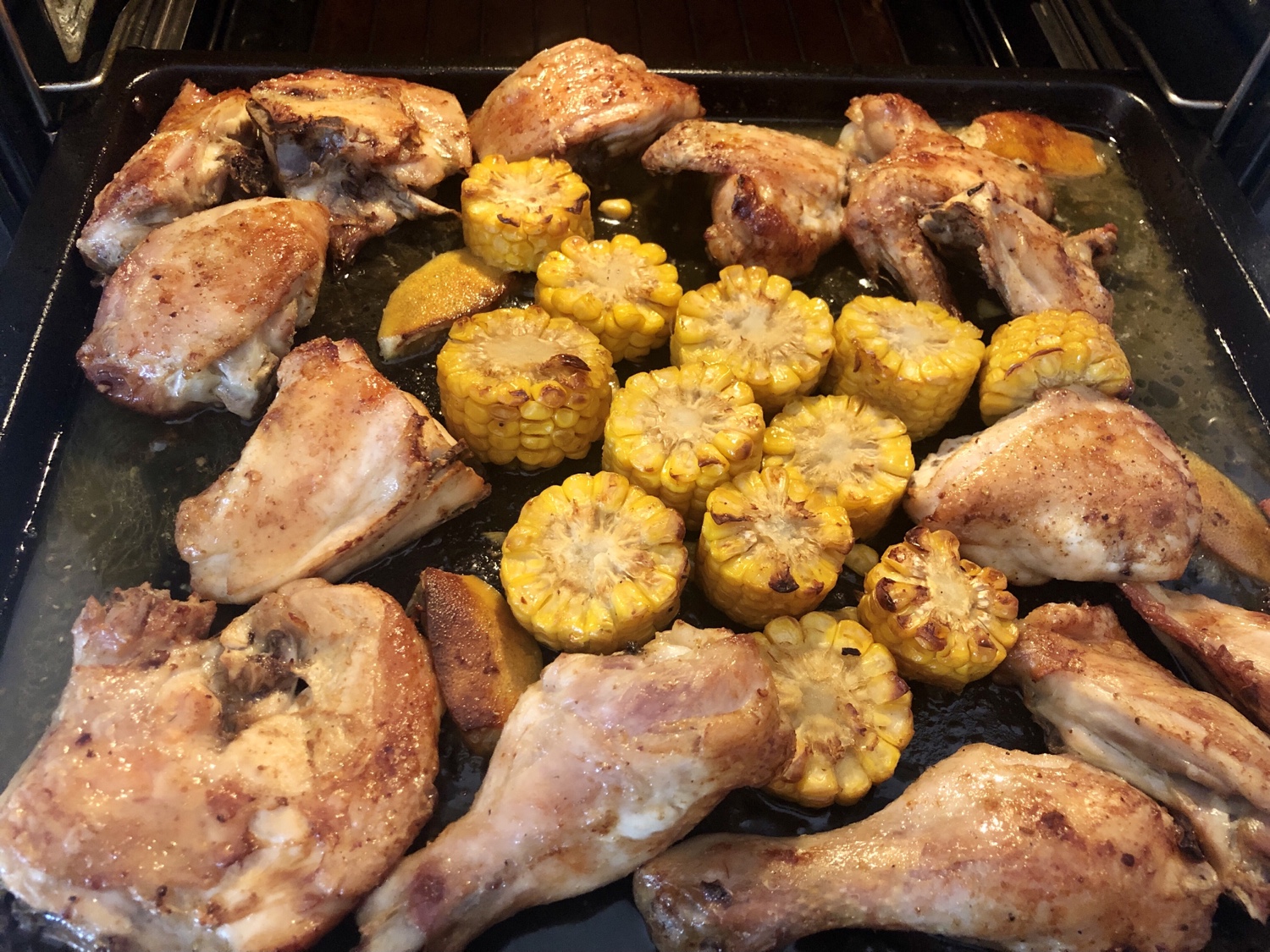 - Sacar la bandeja con cuidado de no quemarse, echar la salsa en un recipiente, darle la vuelta al maíz y al pollo si fuera necesario, rociarla por encima de todo y volver a poner 10 min., mas a 190° si gusta muy dorado subir a 200°, dependiendo del tipo y potencia del hornos.