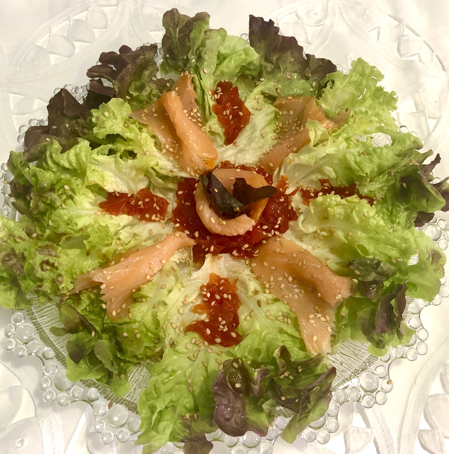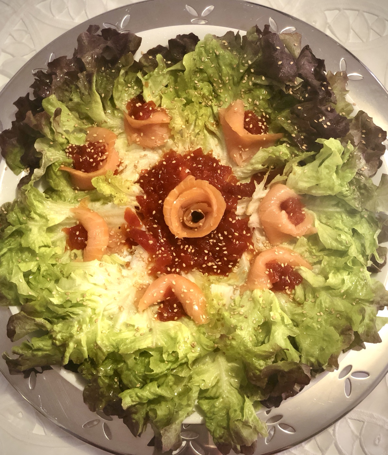 - Colocar el salmón en flor en el centro y por encima de la lechuga el resto de salmón con los pimientos reservados.
