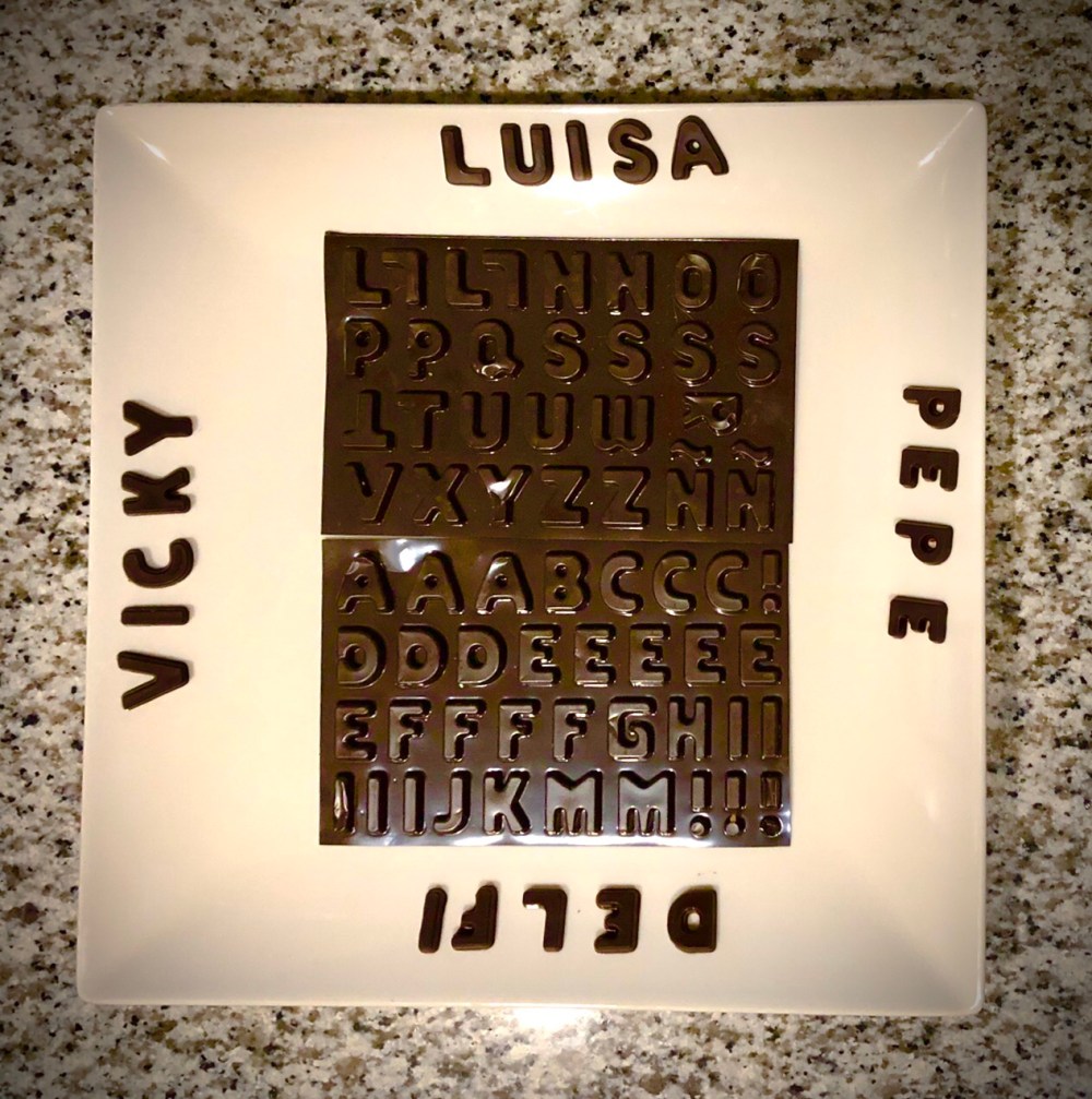 Estoy preparando algunas cosas para adelantar trabajo de mañana, aliñar unos boquerones, hacer unas cremas, un paté. Y algo que nunca había hecho y se me ocurrió hacer este año, el nombre de los invitados con pequeñas letras de chocolate, quedaron muy monas.