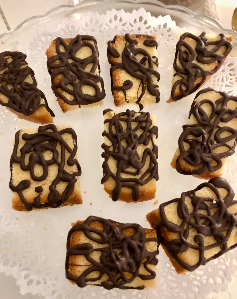 También se pueden cortar unos trozos de bizcocho, poner encima de una superficie cubierta con papel vegetal, y rociar con chocolate fondant puesto en una manga pastelera, después de fundirlo 2 min. en el microondas. Dejar endurecer y serán unos pequeños pastelitos como los de la foto.