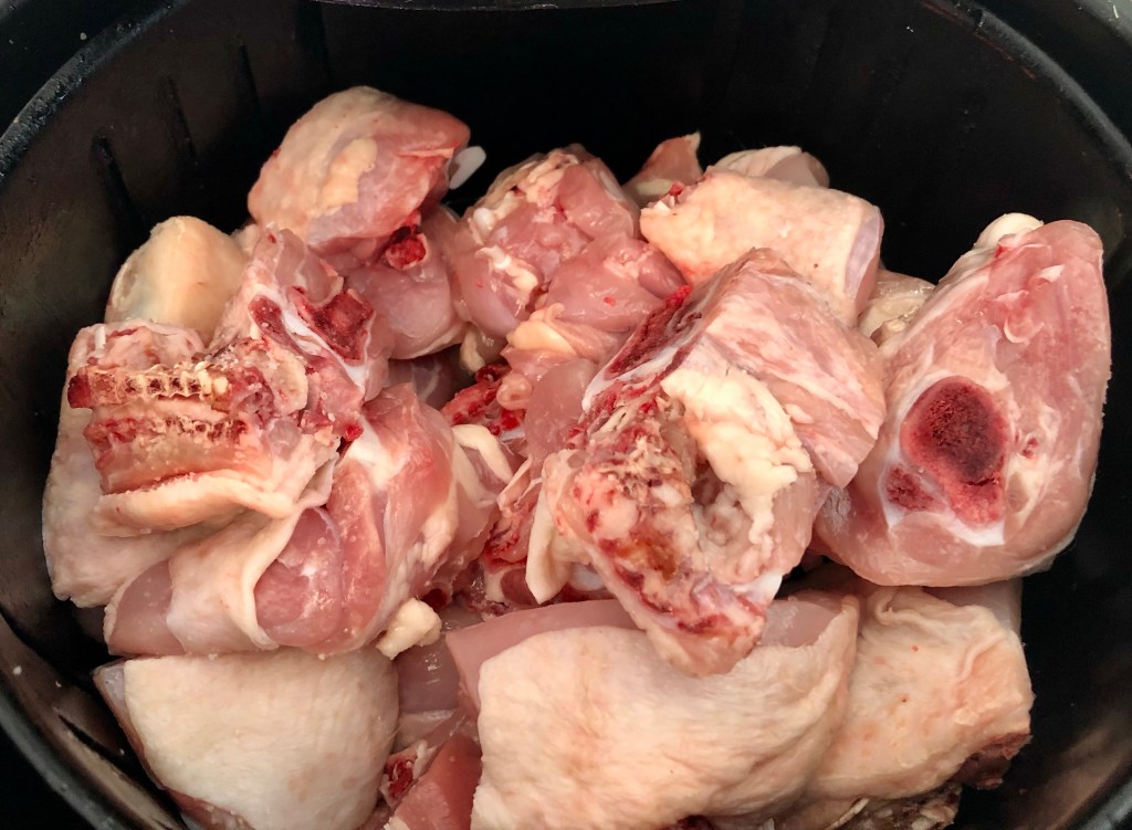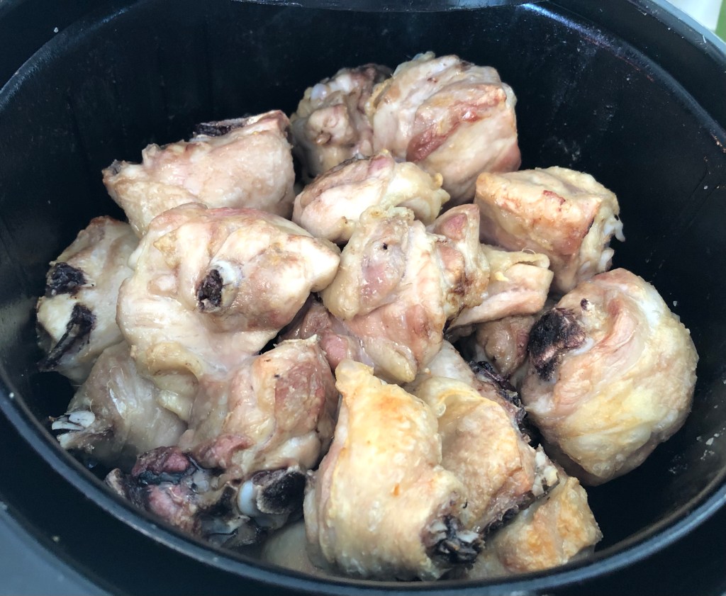 - Poner el pollo troceado en el cesto de la freidor, programar 20 min. 180º, dando vueltas de vez en cuando.