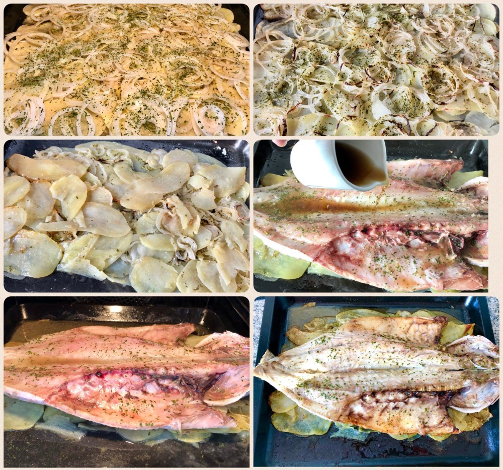 - Sacar la bandeja y doblar los extremos de patata y cebolla hacia el centro dejándolas de cama para la lubina.