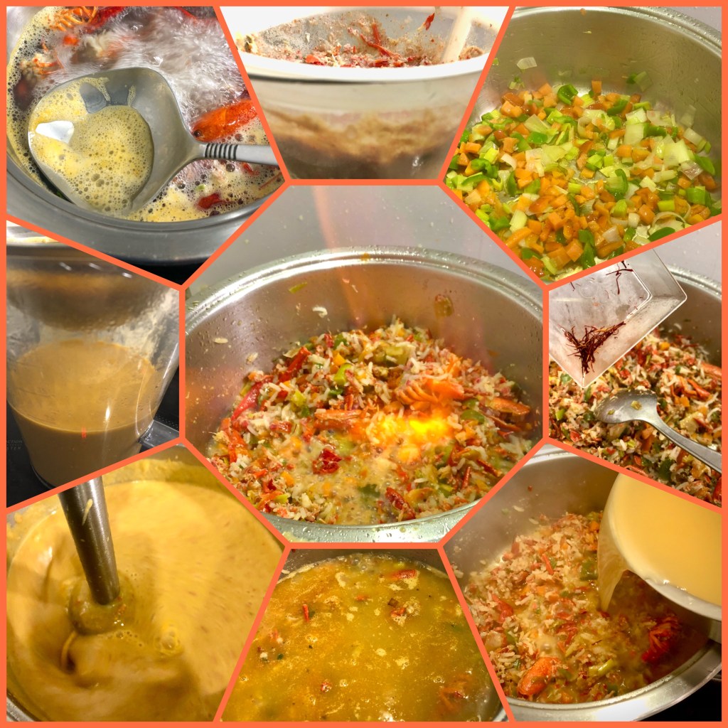 - Poner a fuego medio la otra cacerola junto con el aceite, echar las hortalizas, los ajos, rehogar 3 ó 4 min., añadir los cuerpos de cangrejos, saltear todo, incorporar el arroz, el azafrán, un poco sal y seguir rehogando, rociar con el vino, el brandy y flambear hasta que se consuma el alcohol.
