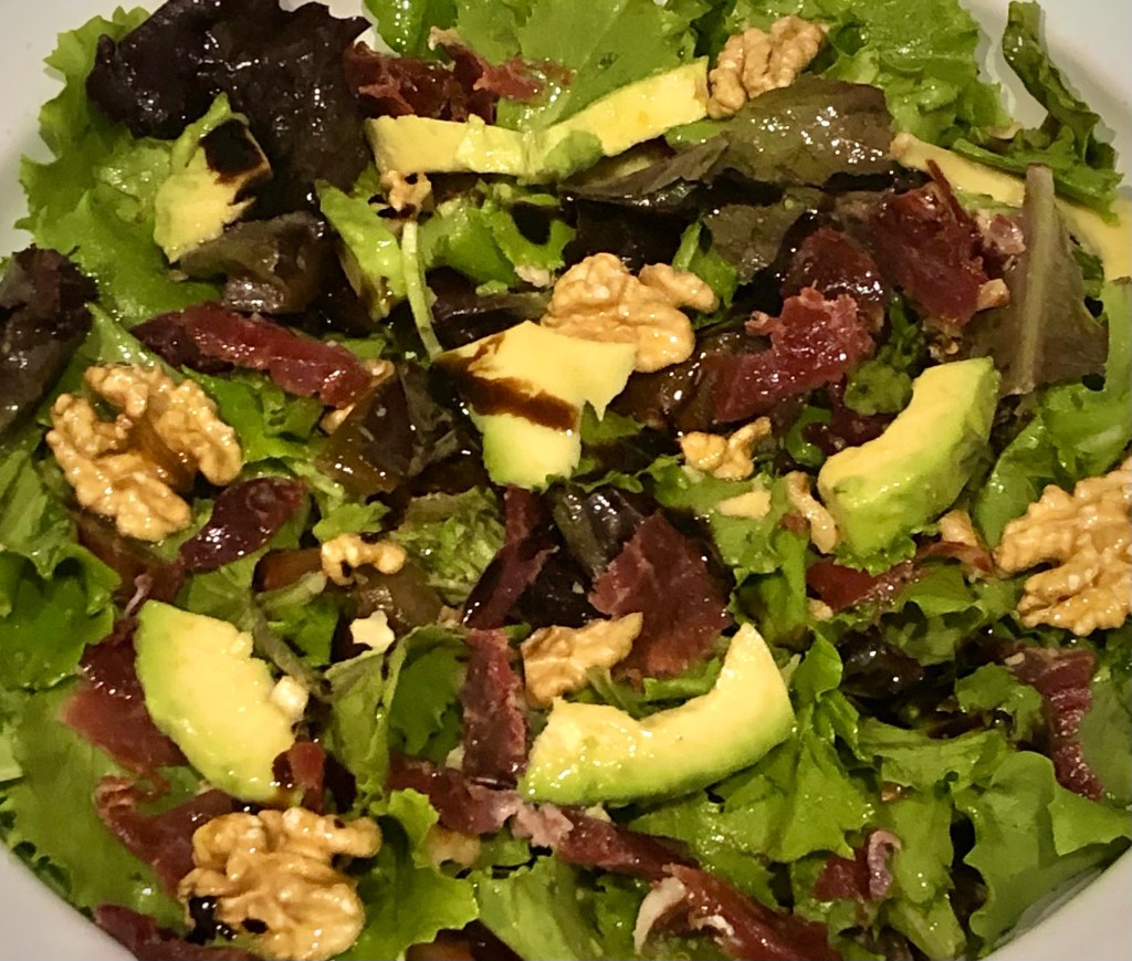 - Decorar con el aguacate reservado, las nueces que no partimos y virutitas de jamón.