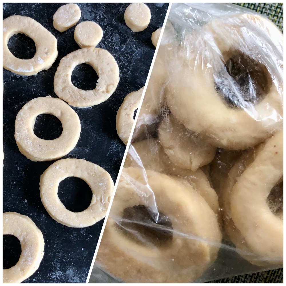 Otra opción es conservarlos congelados; como podéis ver en las fotos se congelan en la misma bandeja antes de fermentar, una vez congelados se meten en una bolsa de plástico hasta necesitarlos, que será el momento de sacarlos, ponerlos en una bandeja para descongelarlos, fermentar y freír.