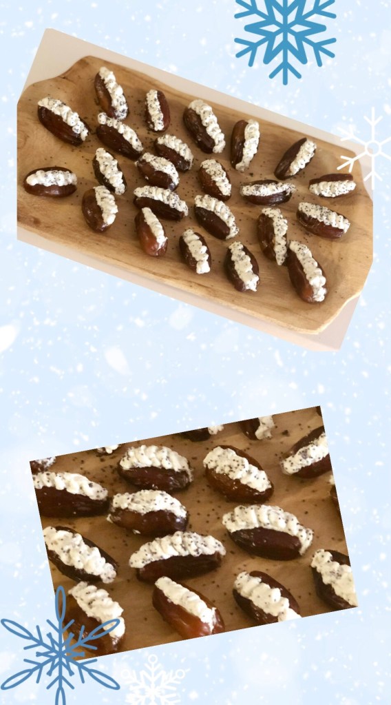- Comprar una tarrina de queso crema ya preparado a las finas hierbas, azul o mousse de queso con nueces y solo tendréis que rellenar los dátiles con él y ponerles por encima semillas de amapola al servir.