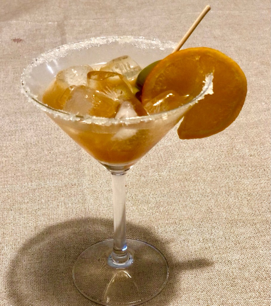 - Echarlo en la copa preparada con los borde de azúcar, naranja, hielo en abundancia, las 2 aceitunas pinchadas en un palillo largo.