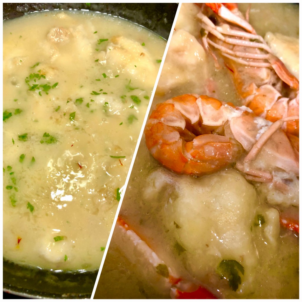 - Incorporarles el azafrán, el vino y mover un poco, añadir parte del caldo reservado, mover en círculos para ligar, ir viendo el punto de espesor de la salsa, si hace falta añadir el resto de caldo, dejar cocer 2 min. moviendo en círculos, rectificar el punto de sal si fuera necesario, cocer otros 2 ó 3 min., a falta de 1 min. añadir las cigalas y el perejil.
