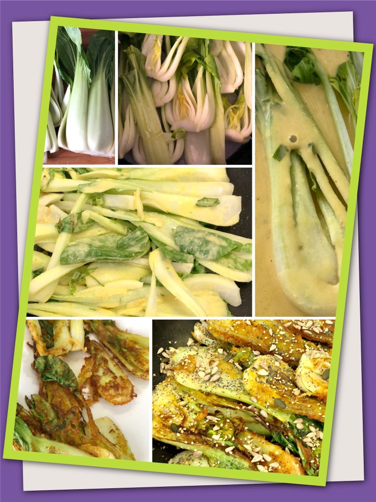 - Echar el aceite en una sartén extendida, calentarlo a fuego medio. Sacar el pack choi del rebozado y ponerlo en la sartén, dejar durante unos minutos que se hagan vuelta y vuelta, sacar y poner sobre papel absorbente para retirar el exceso de grasa.