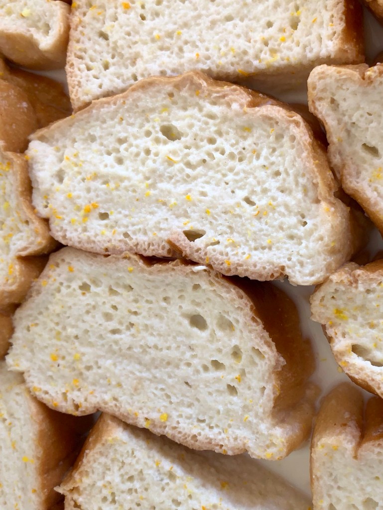 - Pasado ese tiempo quitar la rama de canela, rociar poco a poco por encima del pan ya cortado en rebanadas para que se empapen bien hasta estar bien mojadas y jugosas, dejar hasta que absorban la leche.