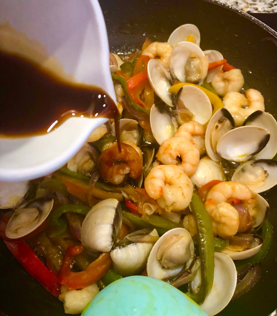 - Añadir la soja a las verdura y marisco, mas un poco de agua de cocción al gusto, dar el punto de sal y dejar que todo de un hervor.